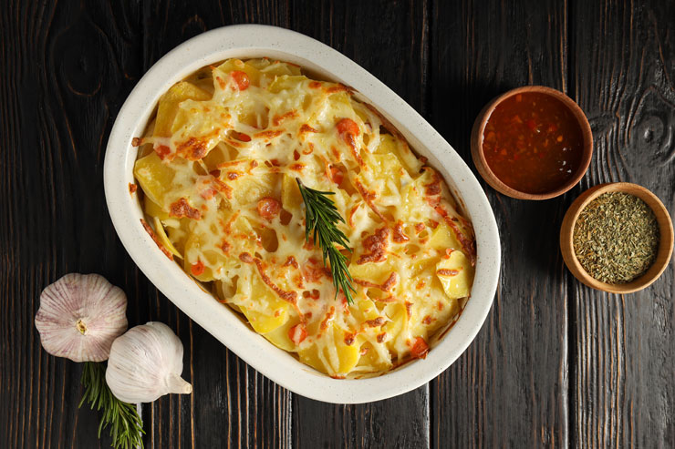 - رص شرائح البطاطس في صينية مدهونة بالزبدة.