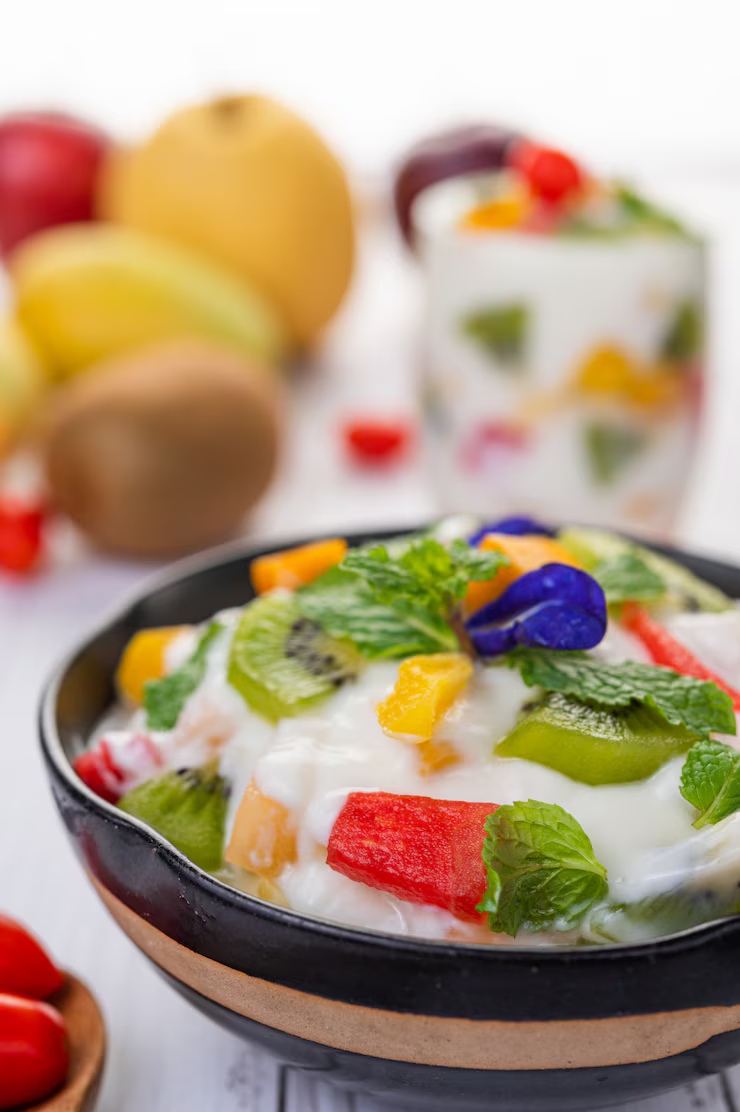 • اخلط الفواكه واللبنة في وعاء.